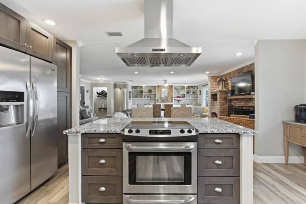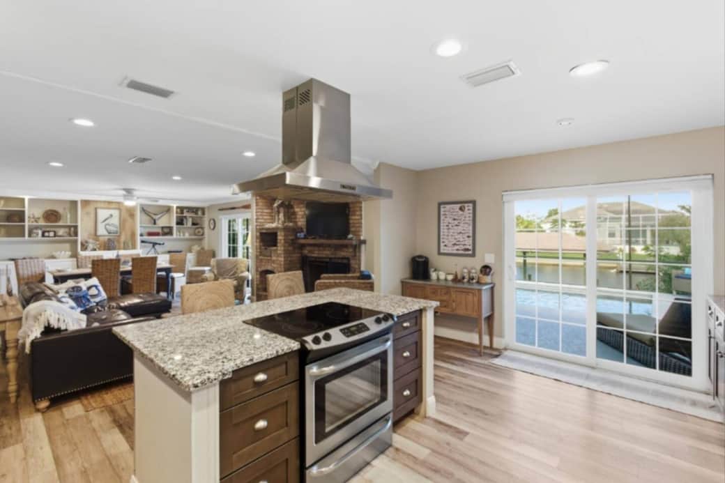 A chef inspired kitchen open to the living room and dining room